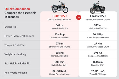 | Royal Enfield Bullet 350 Standard Maroon and Standard Black Petrol | Manual | 349 CC | 20.4 PS @ 6100 rpm | Double Disc | ` 1.85 Lakh* | GET ON ROAD PRICE | |